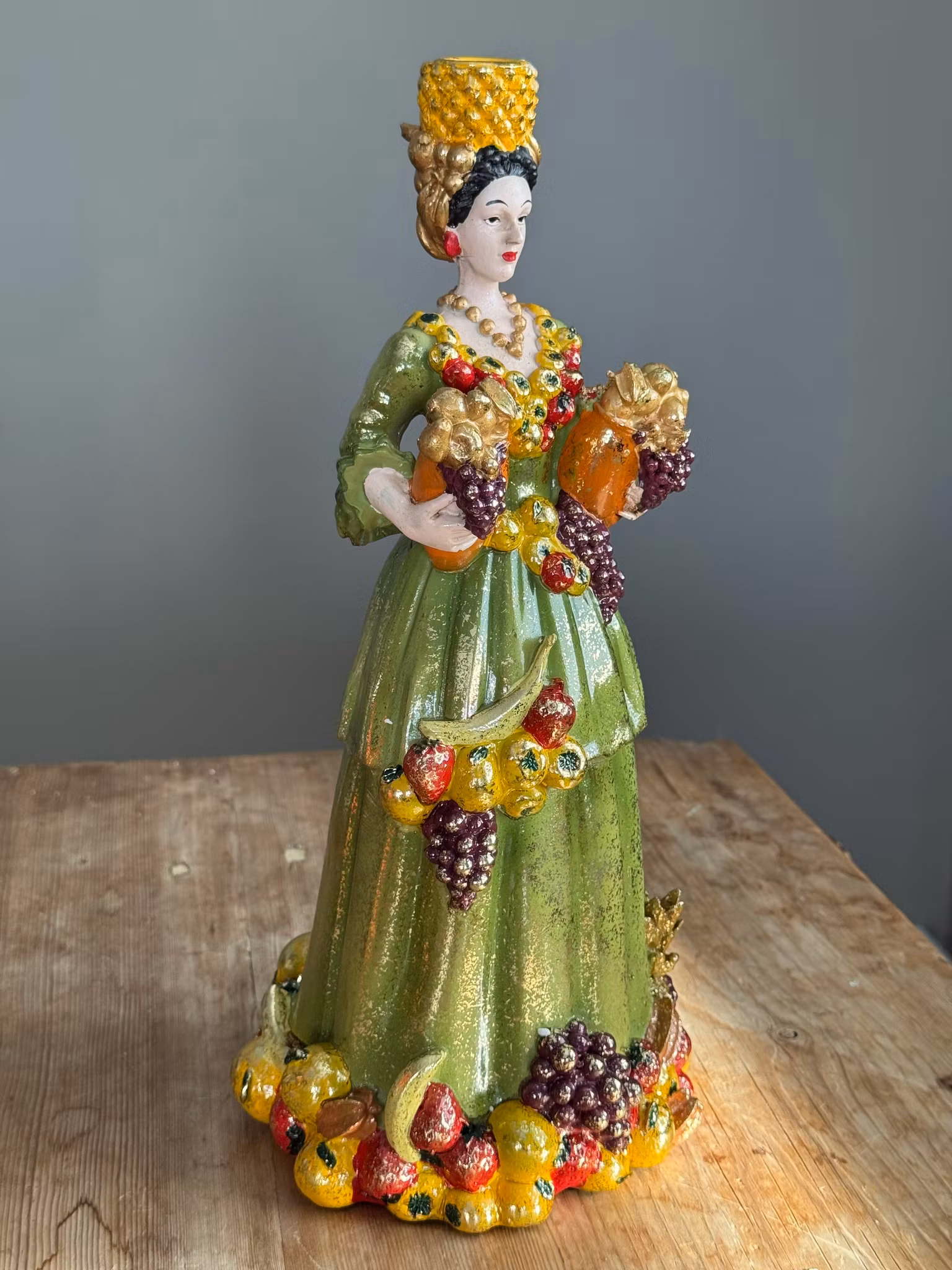Ljusstake Frida Frukt Grön 36cm 629 kr Inred med elegans och lekfullhet med en fin ljusstake föreställande en kvinna i klänning med olika frukter. Tillverkad i poly. I lager. Leverans inom 2-4 arbetsdagar! Lägg i korgen Artikelnummer: 734 Leverantör: A LOT decoration Dela Information Recensioner Frida Frukt Grön – Maximalistisk Statementljusstake 17×17×36