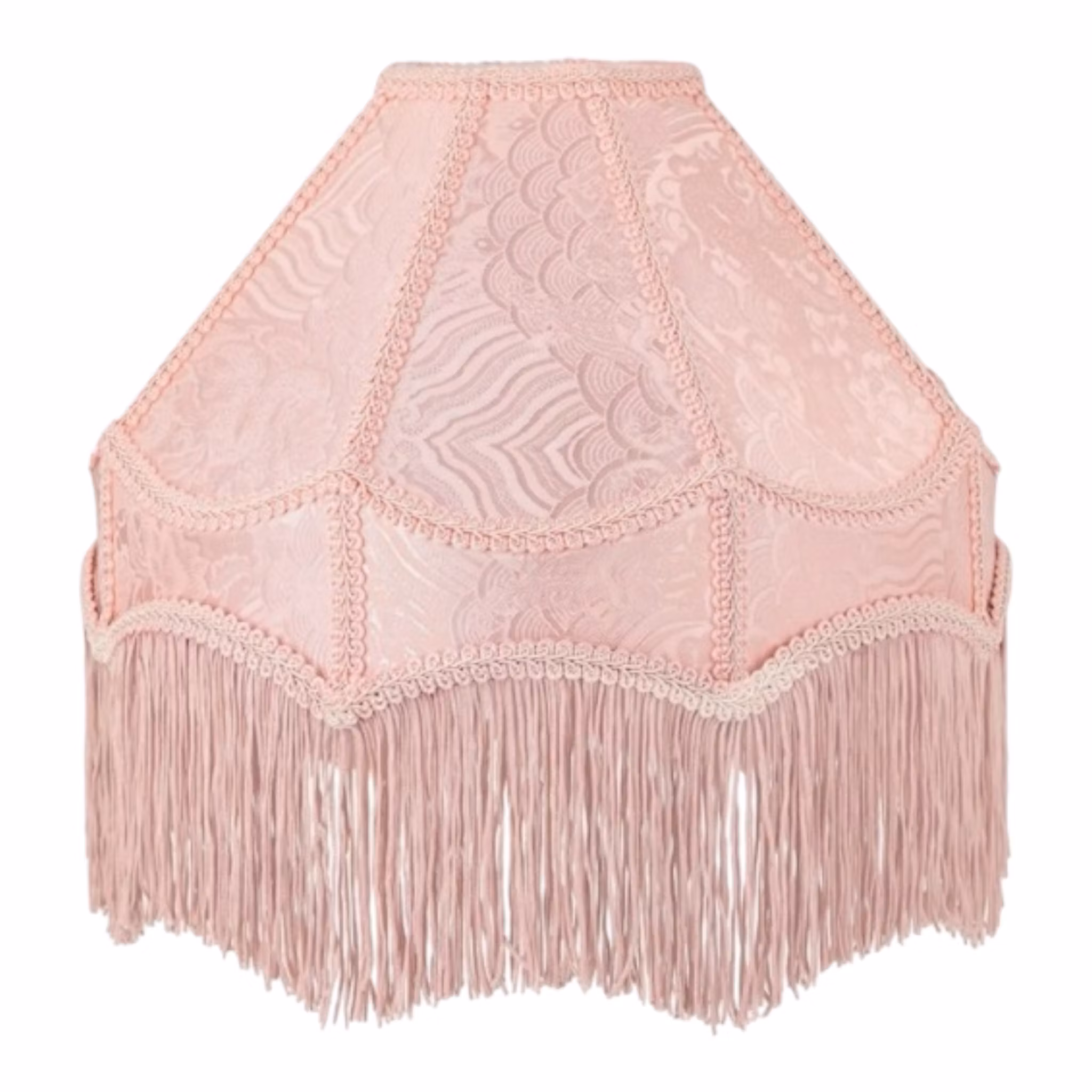 Rosa lampskärm med fransar, vackert sydda kantband och sirliga mönster. Skärmens vändbara lamphållare gör att den kan användas till både bords- och taklampo