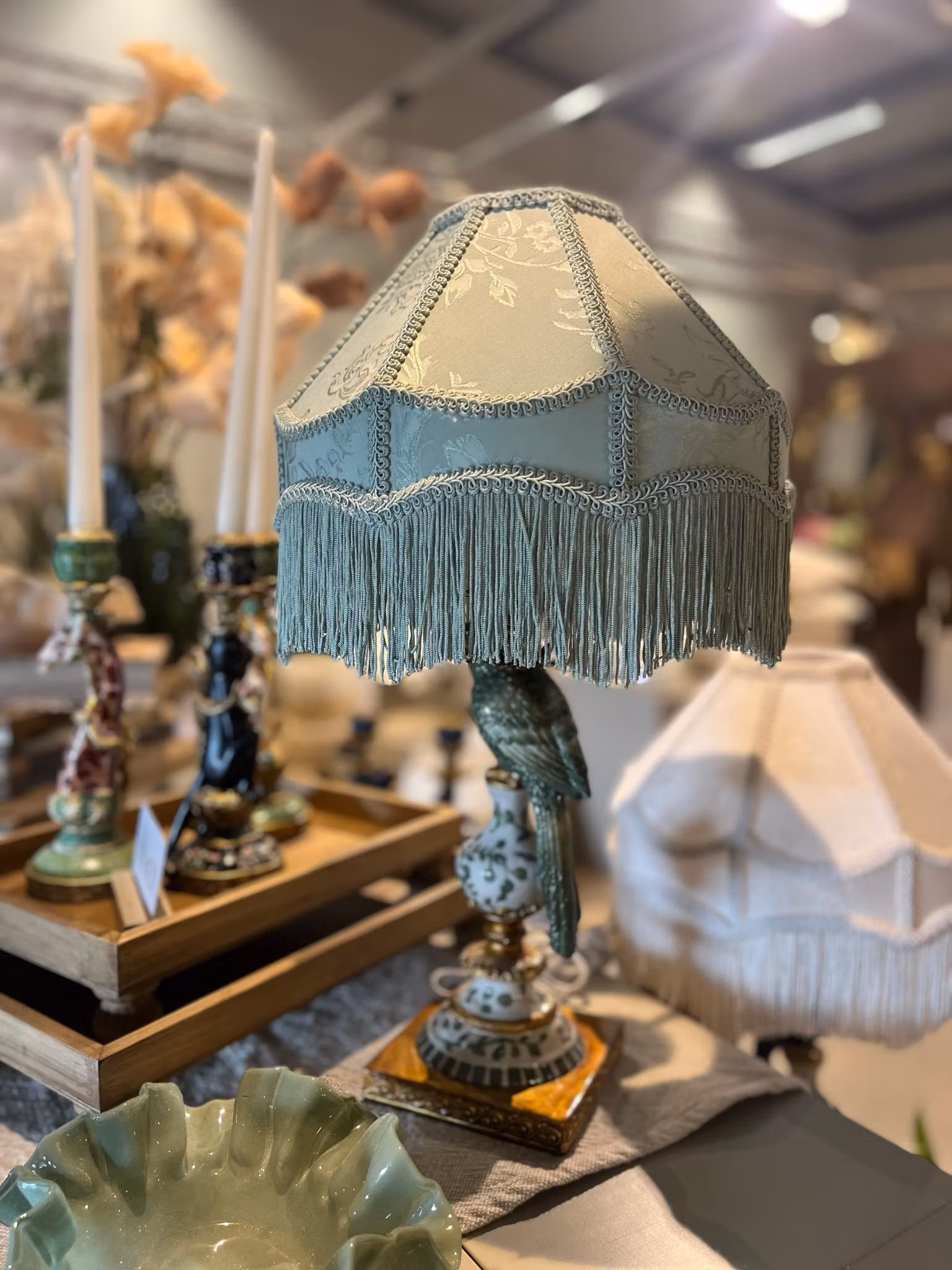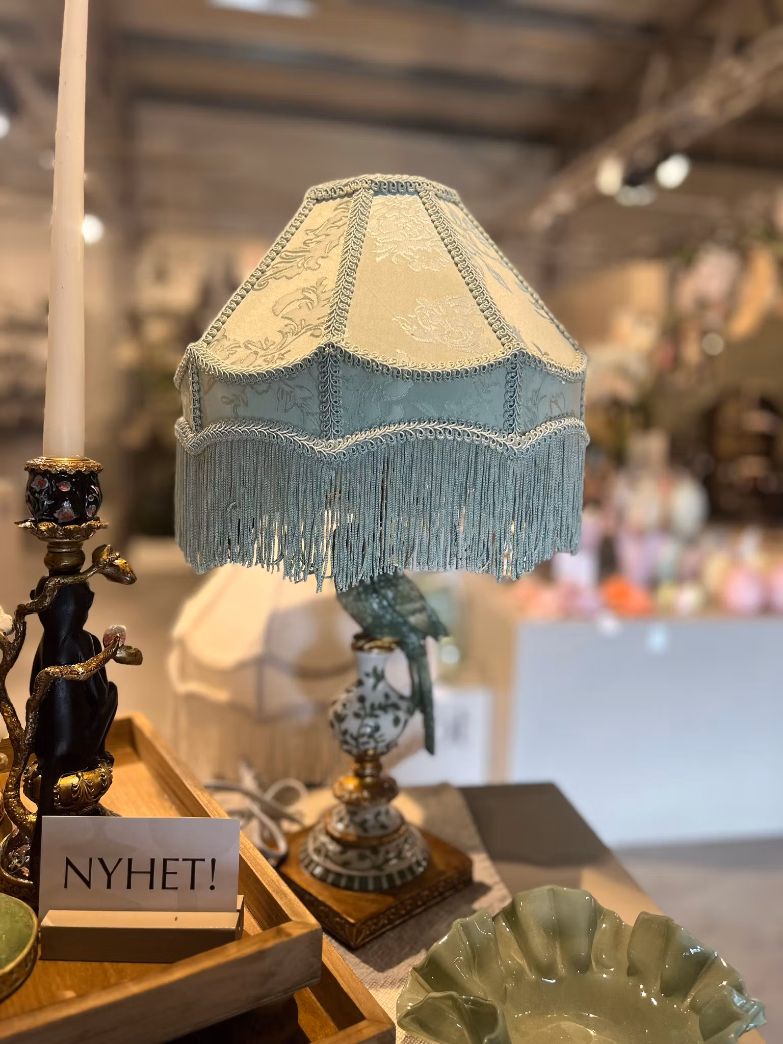 Pistagefärgad lampskärm med fransar, vackert sydda kantband och sirliga mönster. Skärmens vändbara lamphållare gör att den kan användas till både bords- och taklampor. Finns i flera färger.