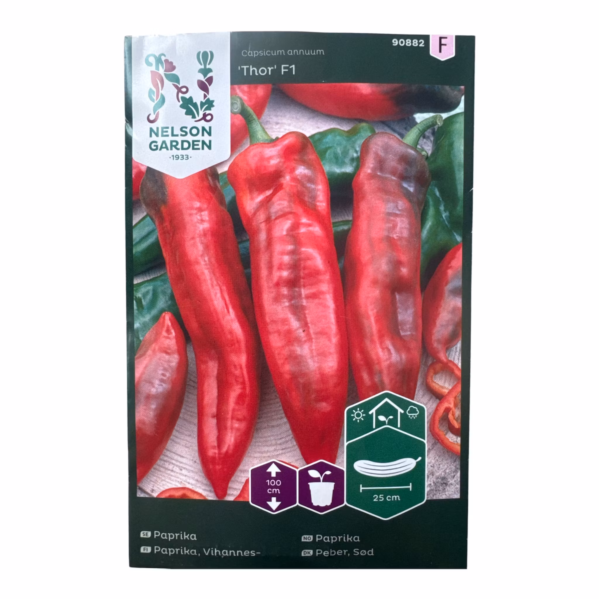Paprika ‘Thor’ F1 är en kraftigväxande paprikasort som ger långa, avlånga frukter på upp till cirka 25–30 cm. Frukterna mognar från grönt till intensivt rött och har en söt och fyllig smak som passar utmärkt i både matlagning och sallader.