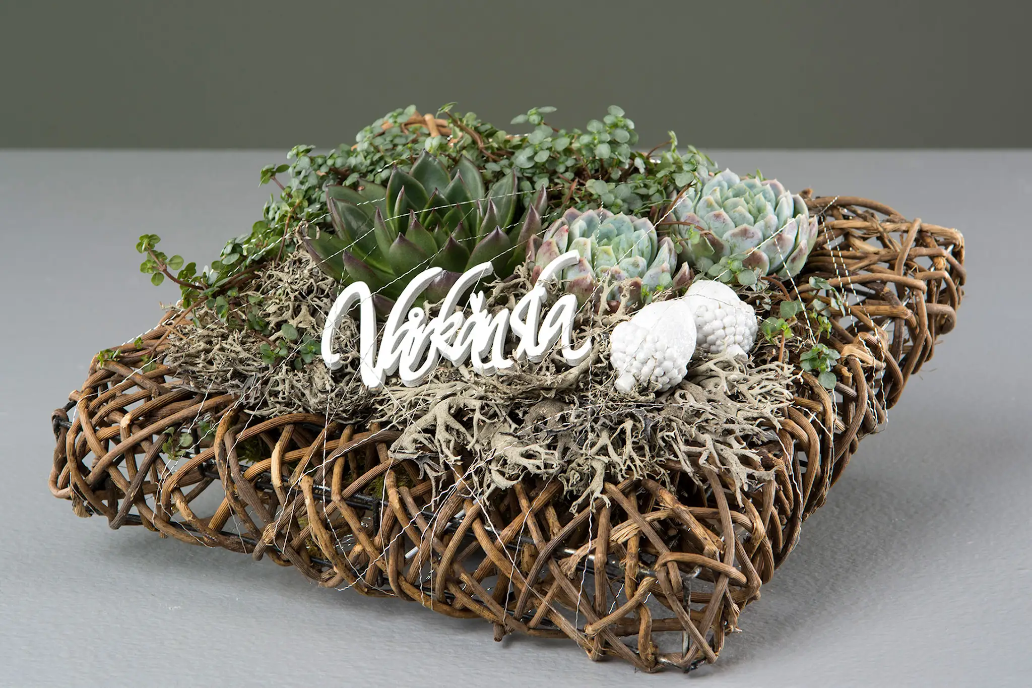 Kvadratisk krans i naturmaterial. Kransen har en botten och är en bra bas för blomsterarrangemang. Kan kombineras med kottar, mossa, blommor, sticks m.m