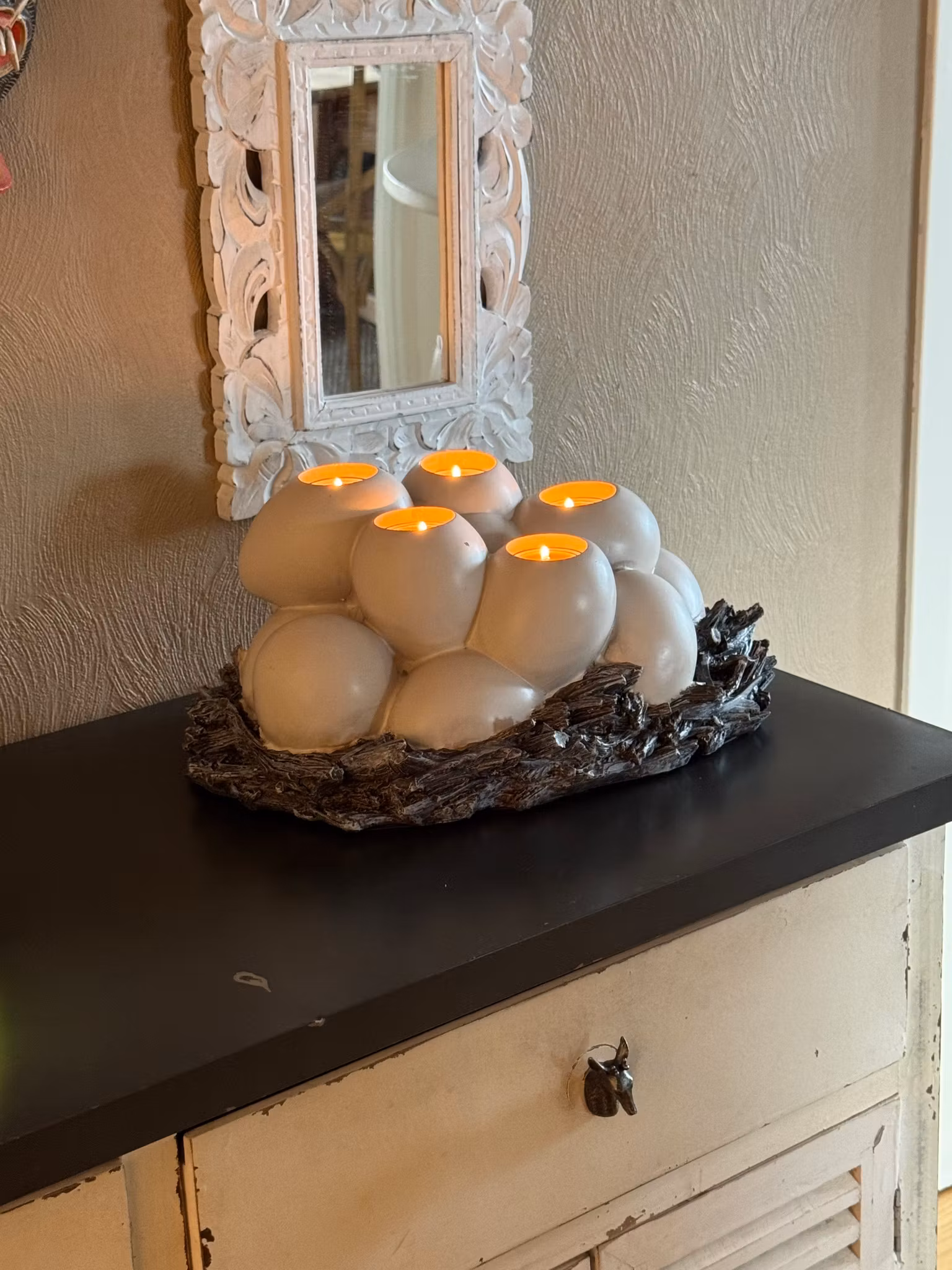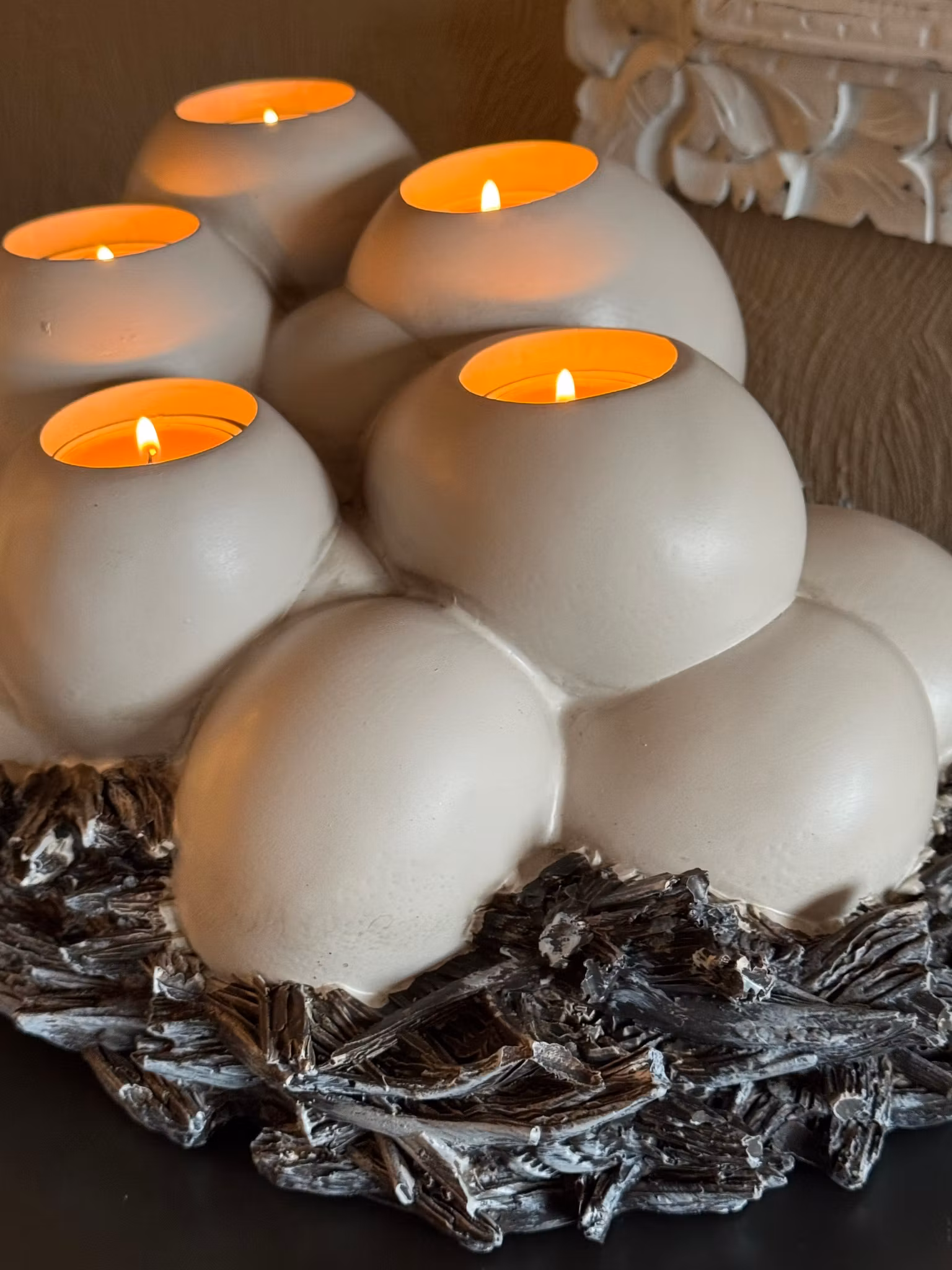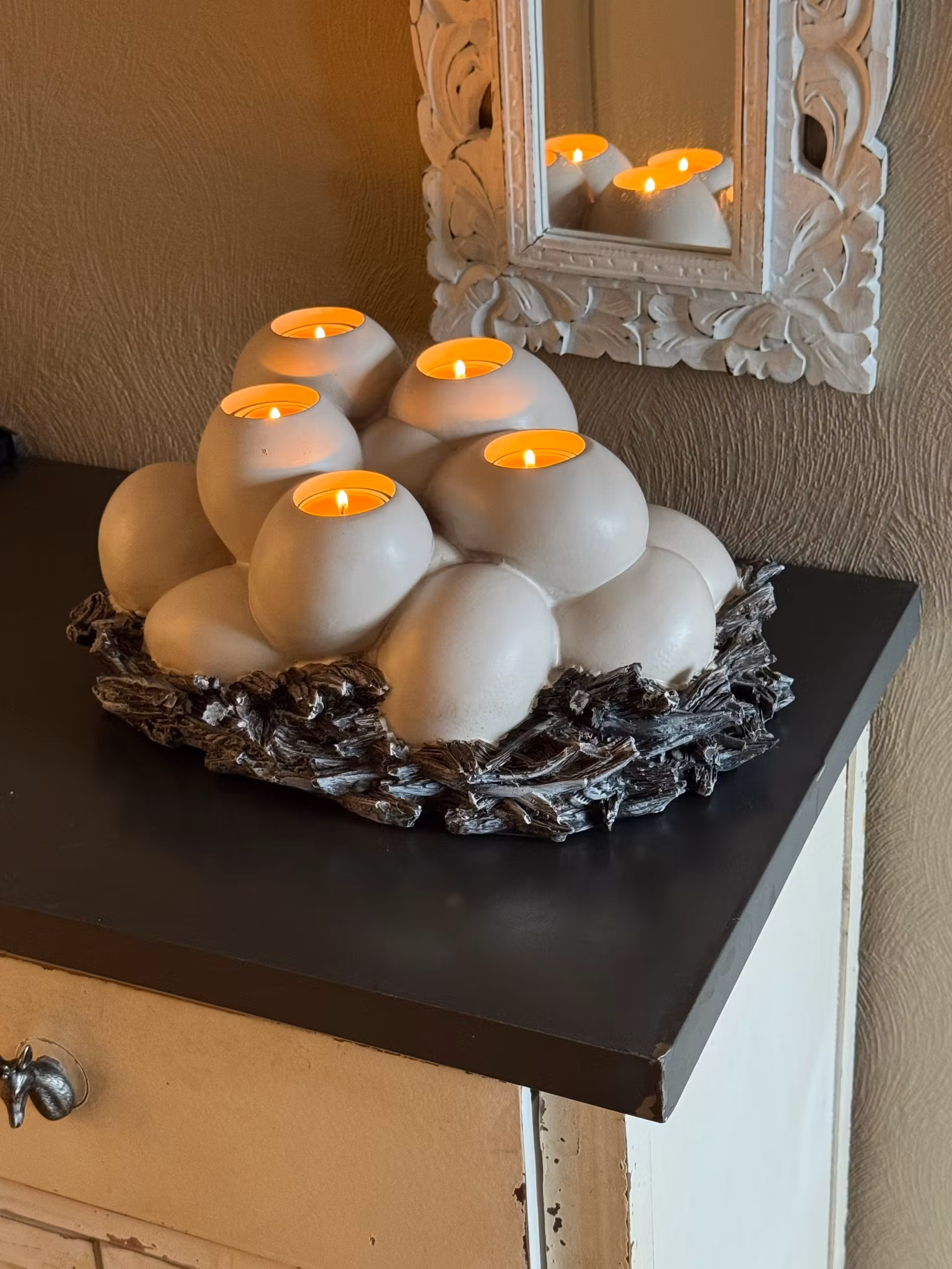 Elegant bordsdekoration som ger ett stämningsfullt intryck. Stora ägg vilar i ett rede av gråa kvistar med plats för 5 värmeljus. Perfekt för att skapa en varm och inbjudande atmosfär. Dekorationen har en vacker antik finish och är tillverkad av polymaterial, en kombination av krossad grus och plast, vilket ger ett unikt och naturligt utseende. Mått 40x30x17 cm.