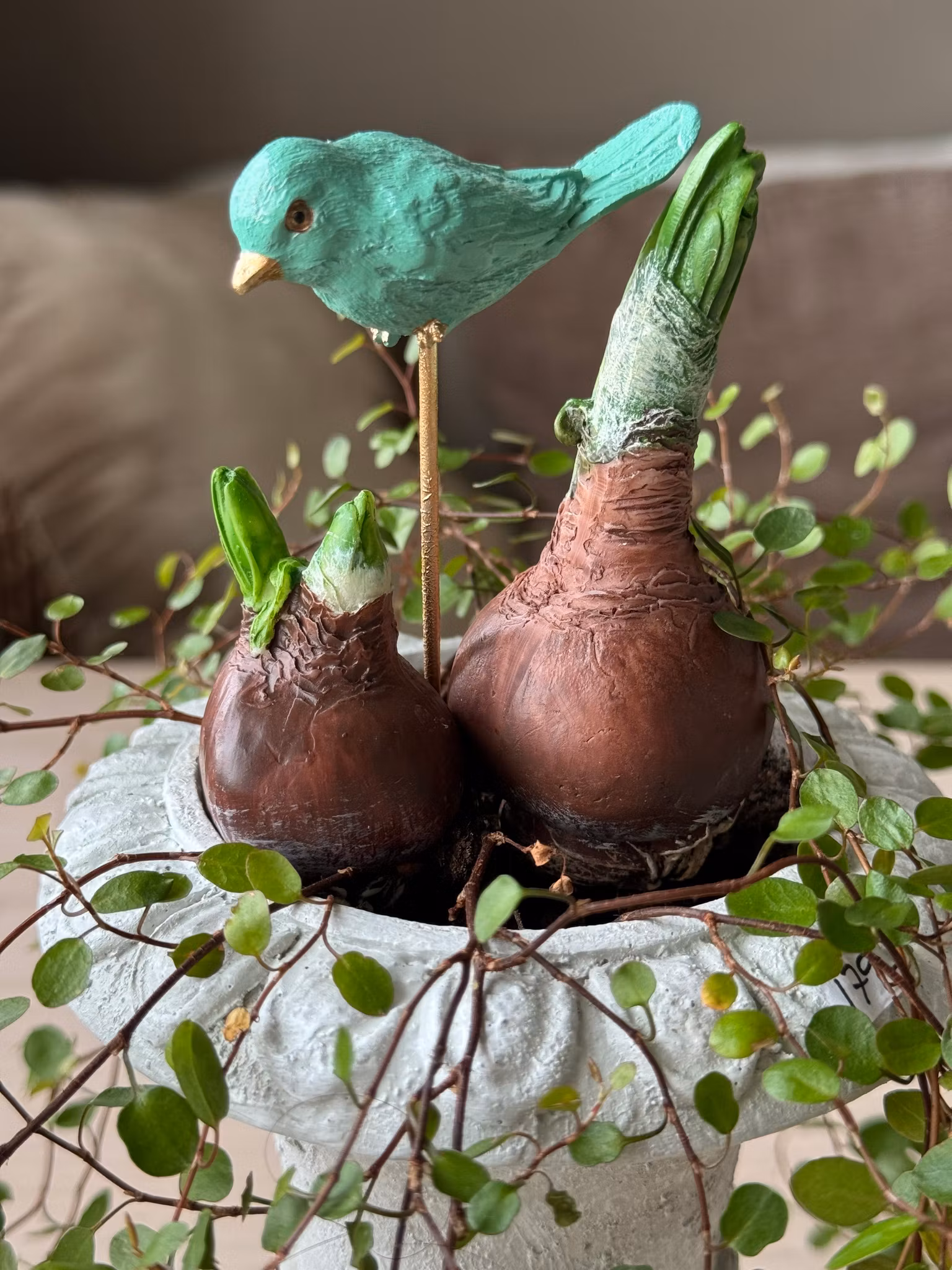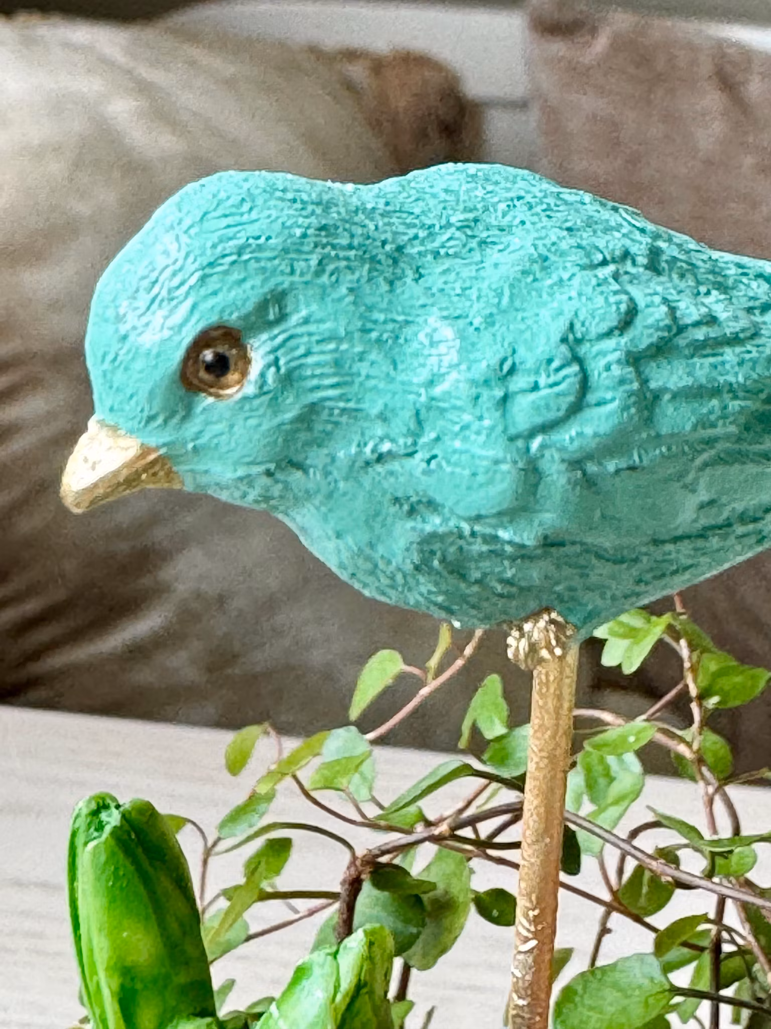 Turkos fågel med guld/mässings metall-pinne att sticka i blomsterarrangemang Pinnen är 13 cm och själva fågeln ca 6x2,5 cm och gjord i ett polymaterial.