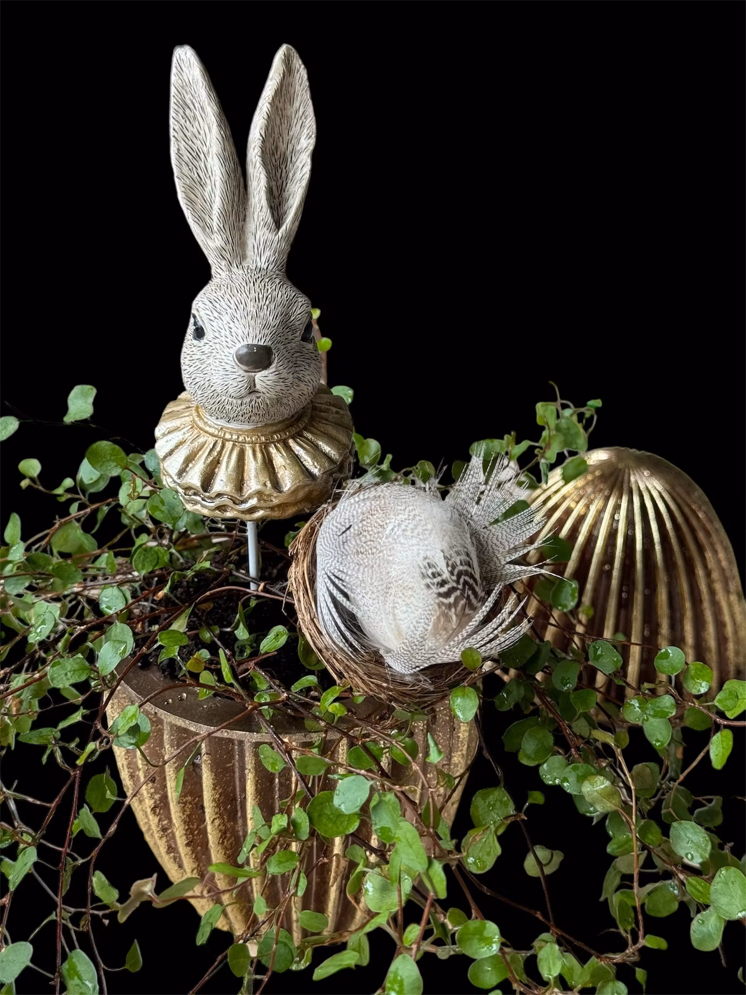 Blomsterpinne i metall med charmigt kaninhuvud och guldkrage. Handgjord i polymaterial, unikt hantverk. Perfekt för att förgylla din inredning!
